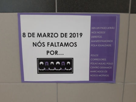 O alumnado da Comisión de Igualdade realizou unha artística, fermosa e significativa exposición de motivos polos que decide asistir á folga do 8 de marzo, vinculados á defensa dos dereitos da muller e da loita contra a violencia machista.